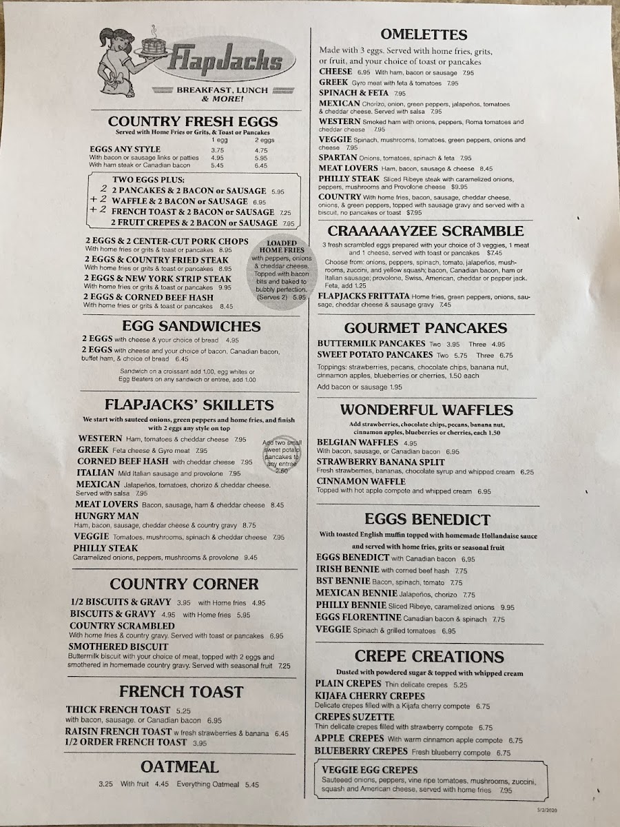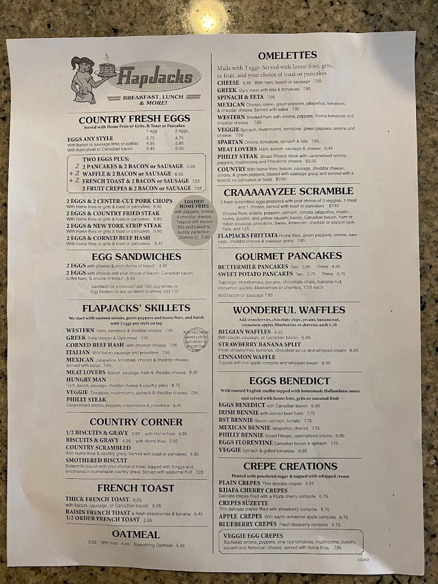 Whether you’re settling in for a relaxed breakfast with family or grabbing a quick, satisfying meal before heading out for the day, Flapjacks’ menu fits naturally with the cozy, neighborhood café experience. With options ranging from crispy bacon and scrambled eggs to specialty skillets and sweet crepes, the food complements the casual, laid-back setting where comfort and familiarity take center stage.